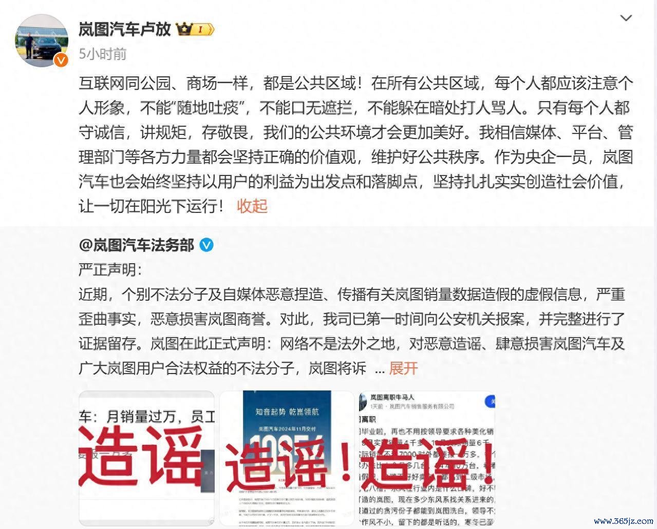 事情发酵后,岚图汽车法务部对此发表紧要声明,叱咤“个别违警分子及自媒体坏心合手造、传播关连岚图销量数据作秀的无理信息,严重诬蔑事实。”。岚图将诉诸一切法律时刻,讲求到底。岚图汽车CEO卢放示意,不行“遍地吐痰”,不行口无守密。