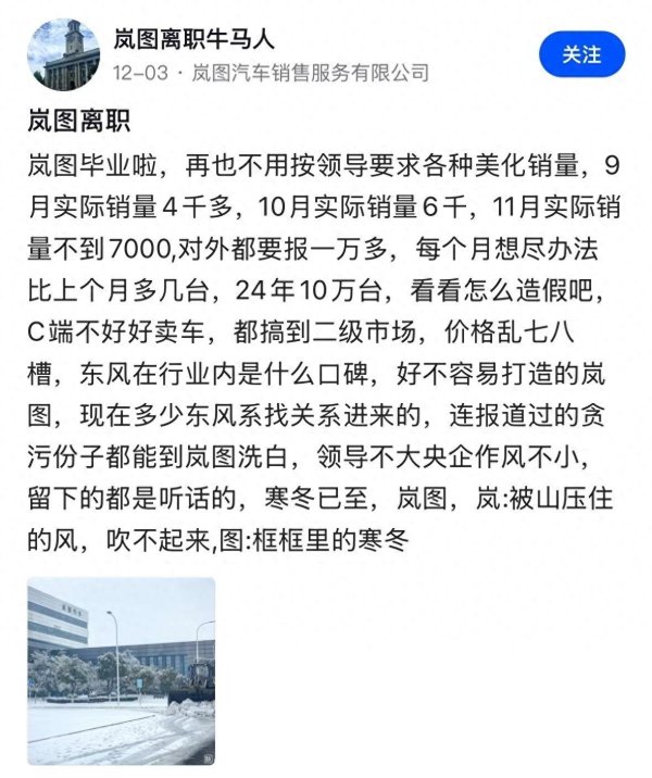 关联词此时此刻,出现了不协调的声息,相对一些谈听途说的音讯,此时堪称是“里面东谈主”爆料,岚图汽车销量作秀。日前,一位ID为“岚图下野牛马东谈主”爆料,岚图汽车销量作秀,一下子收拢了东谈主们的眼球。