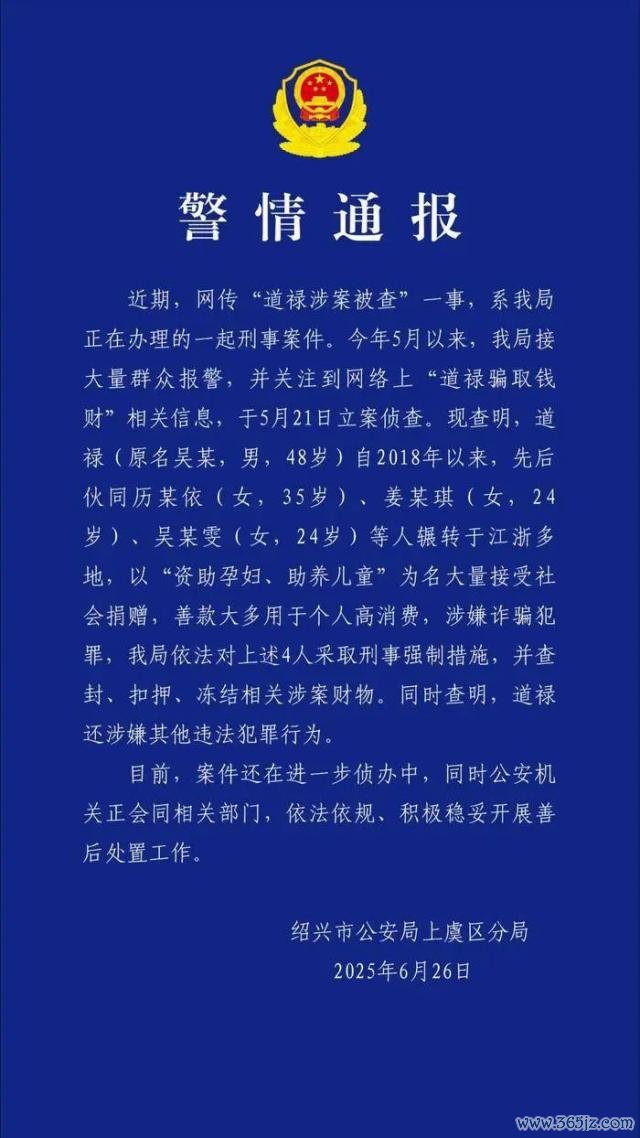 6 月 26 日,浙江绍兴市公安局上虞划分局通报,阐明近期网传"说念禄涉案被查"一事,系该局正在办理的一齐刑事案件。