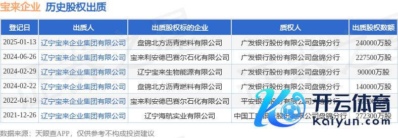 本站音问,左证天眼查APP暴露,在1月13日登记的一则股权出质信息(登记编号:A2111002025000013)中,辽宁宝来企业集团有限公司出质其所握有的盘锦朔方沥青燃料有限公司股权九游体育app娱乐,出质股权数额为240000万股,质权东说念主为广发银行股份有限公司盘锦分行。